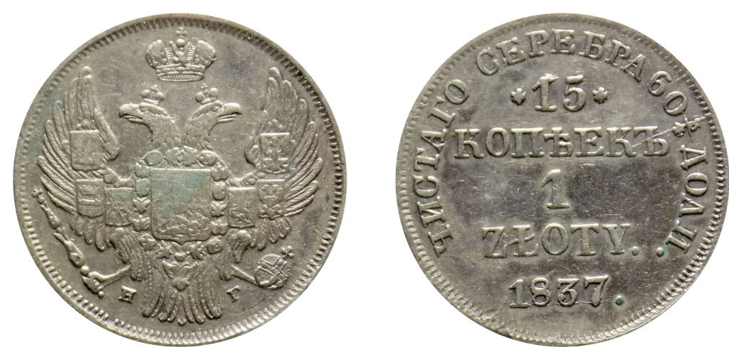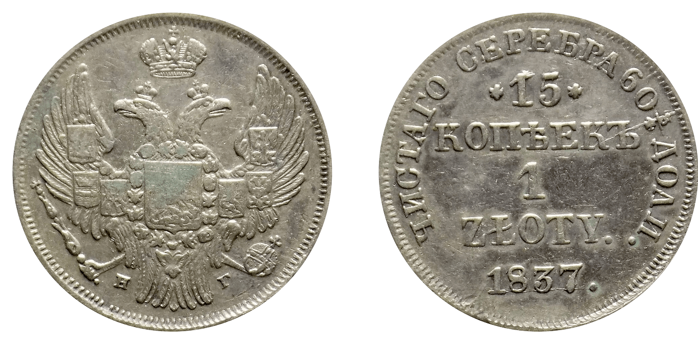 15 października 1832 r. pojawił się ukaz carski, według którego zaczęto emitować pieniądz dwujęzyczny rosyjsko-polski. Jako pierwsza, bita według nowych zasad, pojawiła się moneta o nominale 15 kopiejek = 1 złoty z rokiem emisji 1832.