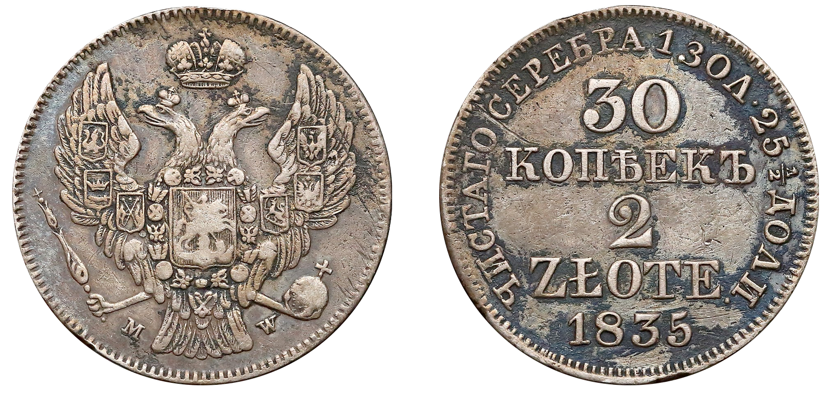 Od 1832 r. na monetach srebrnych, a od 1835 r. na monetach miedzianych orzeł polski na piersi orła rosyjskiego został zastąpiony wizerunkiem św. Jerzego.