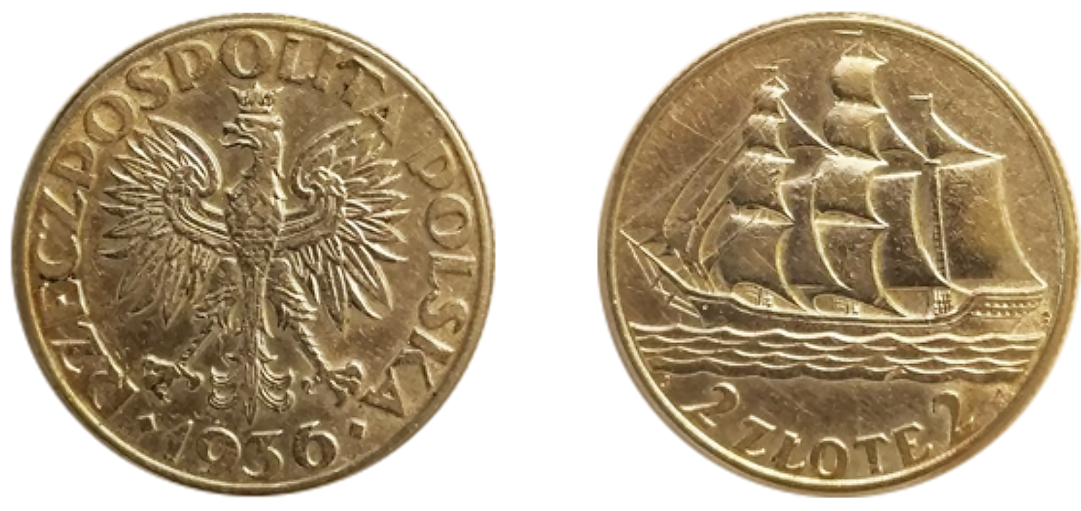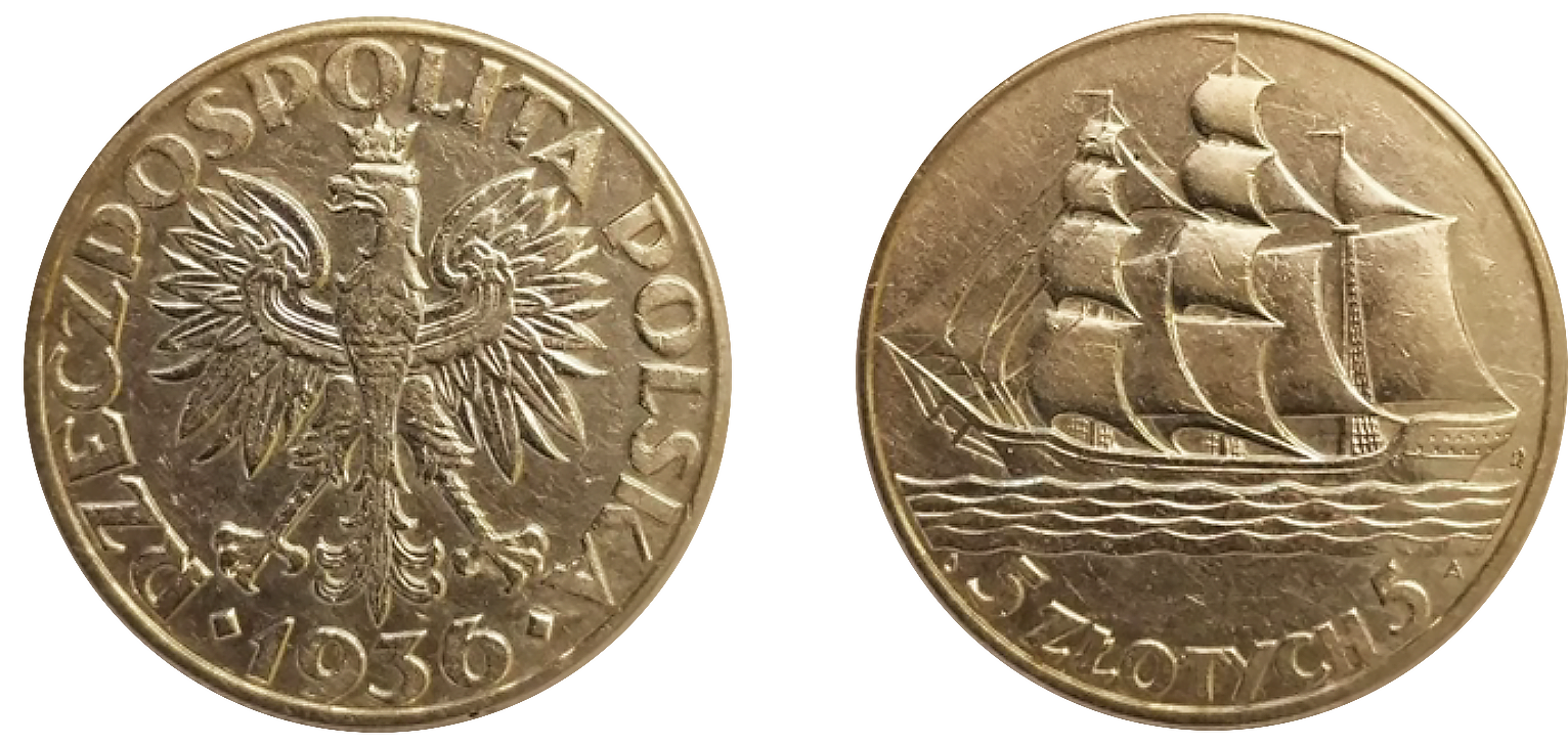 2 ZŁOTE – żaglowiec, 1936 r. 5 ZŁOTYCH – żaglowiec, 1936 r.
