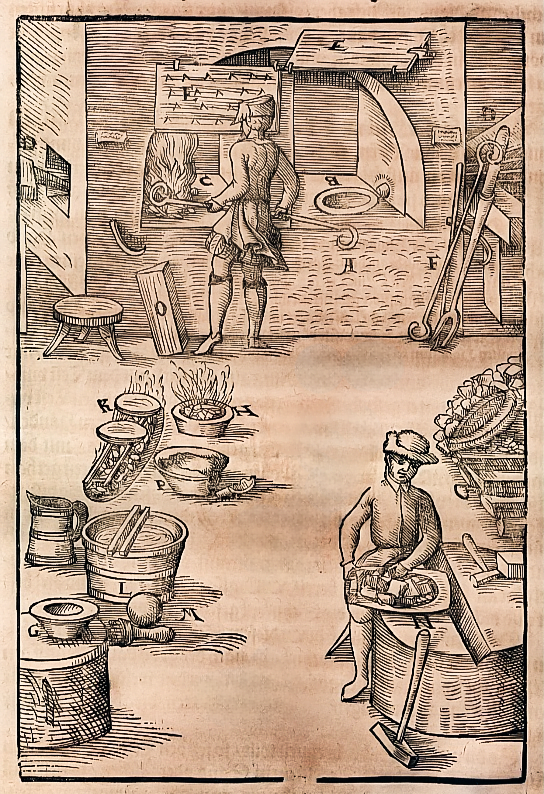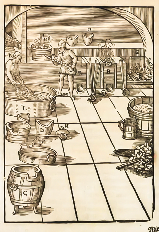 Na rycinie pokazano proces wytwarzania granulatu miedzianego. W kadzi (L) rzemieślnik trzyma zanurzone w wodzie witki, przez które za chwilę zostanie przelana ciekła miedź. Wykonując odpowiednie ruchy witkami, strumień miedzi zostanie rozbity na drobne frakcje, ulegające szybkiej krystalizacji w wodzie